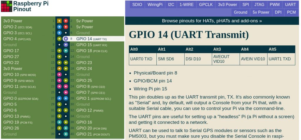 This Raspberry Pi Pinout is an interactive reference to the Raspberry Pi GPIO pins, and a guide to the Raspberry Pi’s GPIO interfaces. Pinout also includes hundreds of pinouts for Raspberry Pi add-on boards, HATs and pHATs.